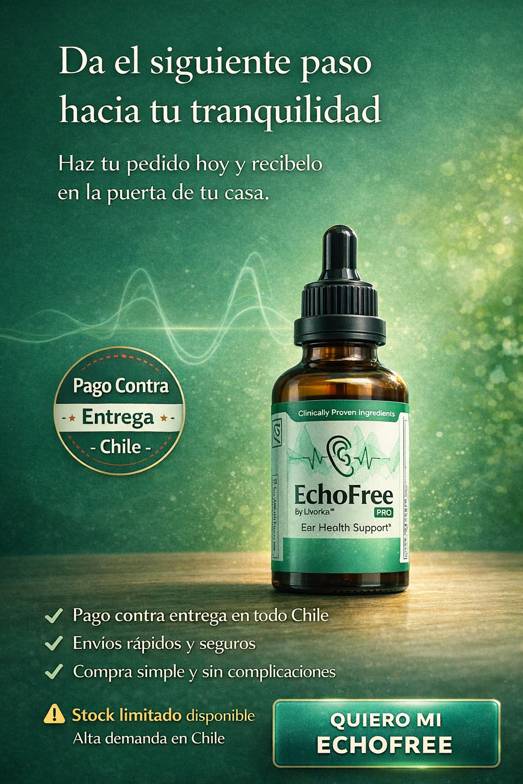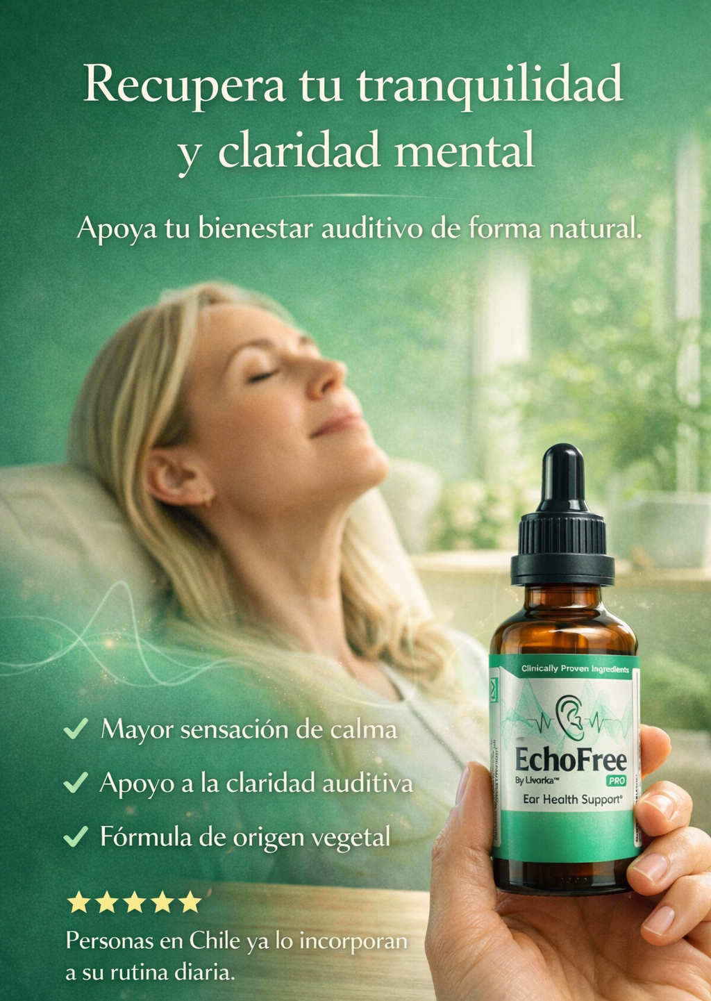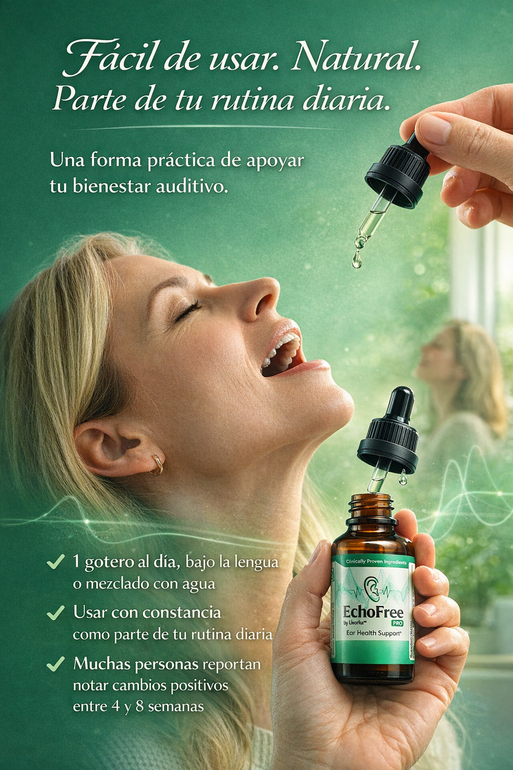 EchoFree es un suplemento líquido natural diseñado para apoyar tu salud auditiva y disminuir el zumbido constante en los oídos (tinnitus) que muchas personas experimentan día a día.