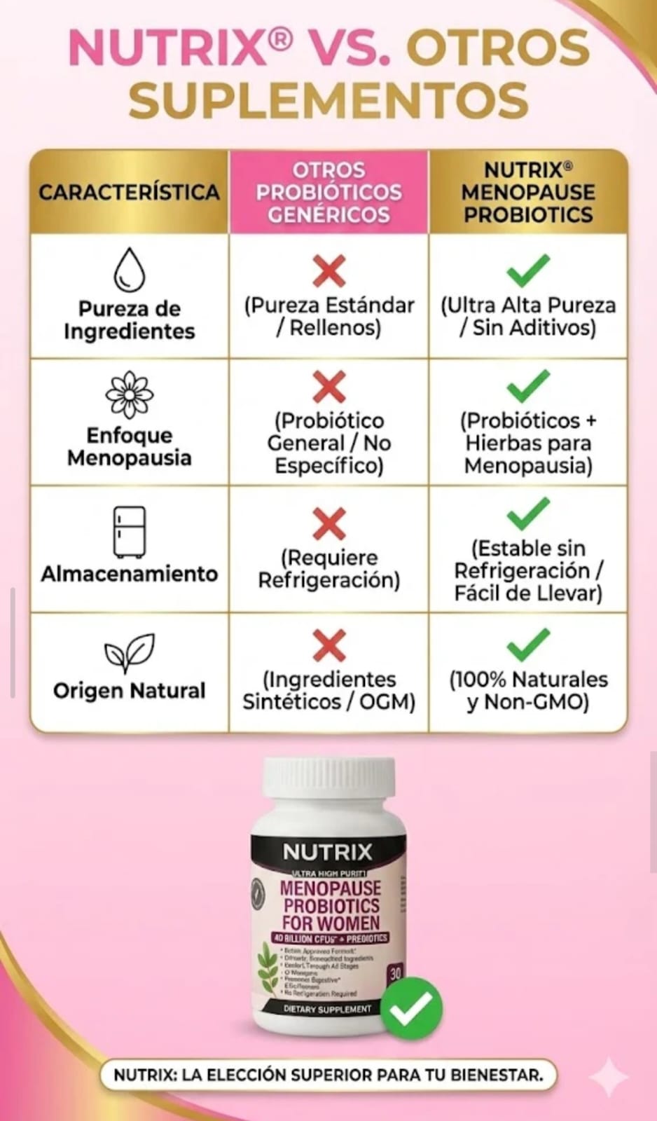 Nutrix Menopause Probiotics for Women combina 40 mil millones de UFC de probióticos con prebióticos y extractos herbales naturales para apoyar tu salud digestiva, emocional y hormonal durante todas las etapas de la menopausia.